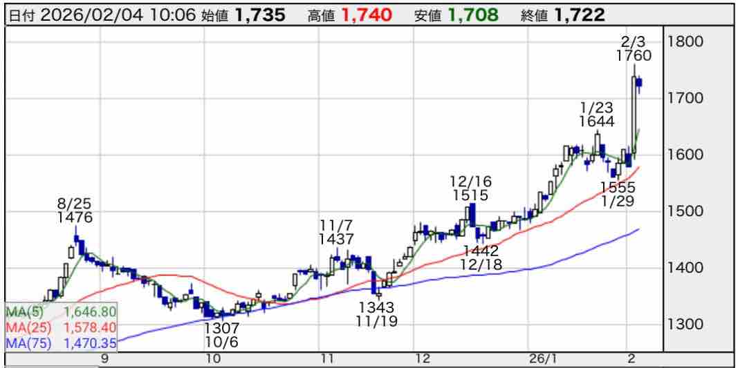 日足のチャートは11月にゴールデンクロスしています。株価は昨日大幅に上昇、本日は落ち着いています。