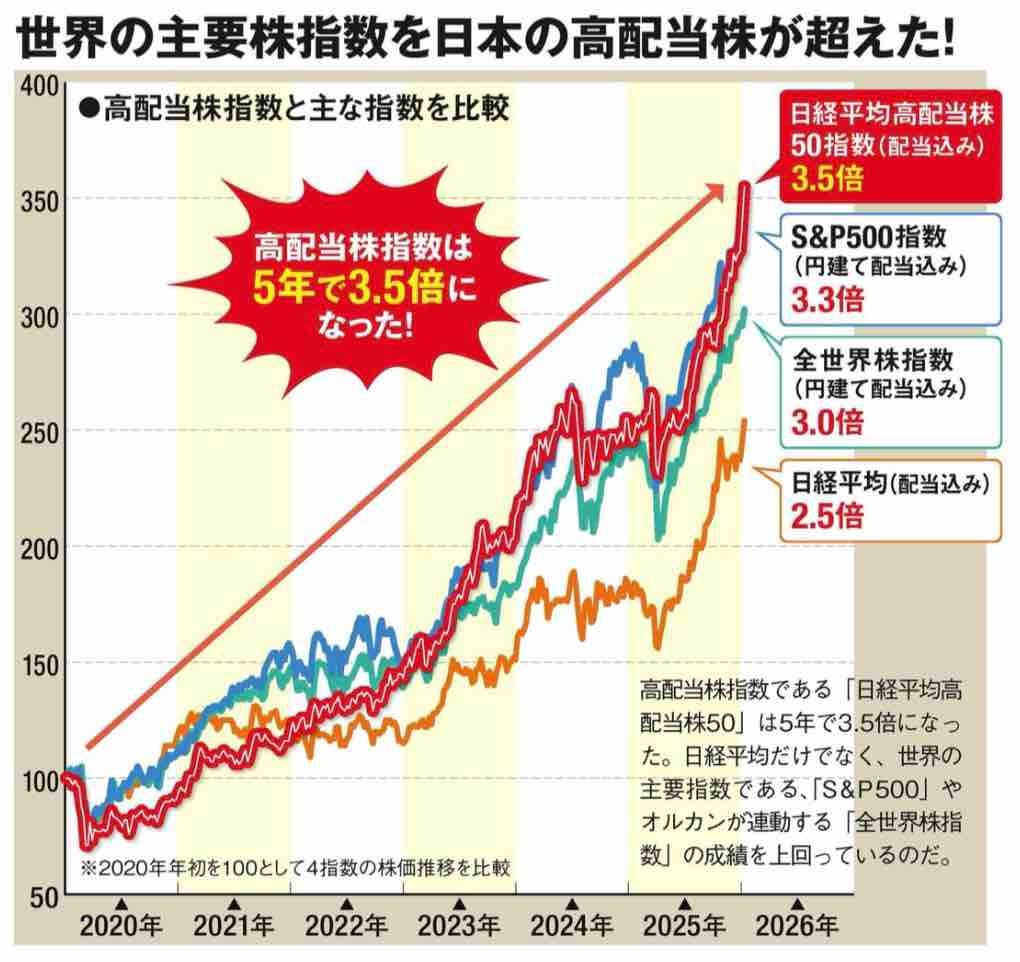 なんと、この5年間で日経平均高配当株指数がS&P500指数を抜いたんですって‼️😳 もし、コロナ禍の時に投資していれば、株価は3.5倍になっています。