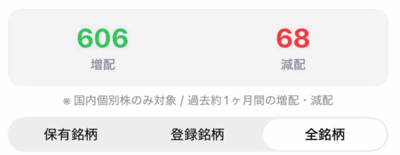 新たな機能に「増配/減配」の項目があり、まずは保有株で見てみると増配銘柄43、減配銘柄4で圧倒的に増配銘柄の方が多かったです。保有しているだけで配当金が増えていくのは嬉しいですね☺️
