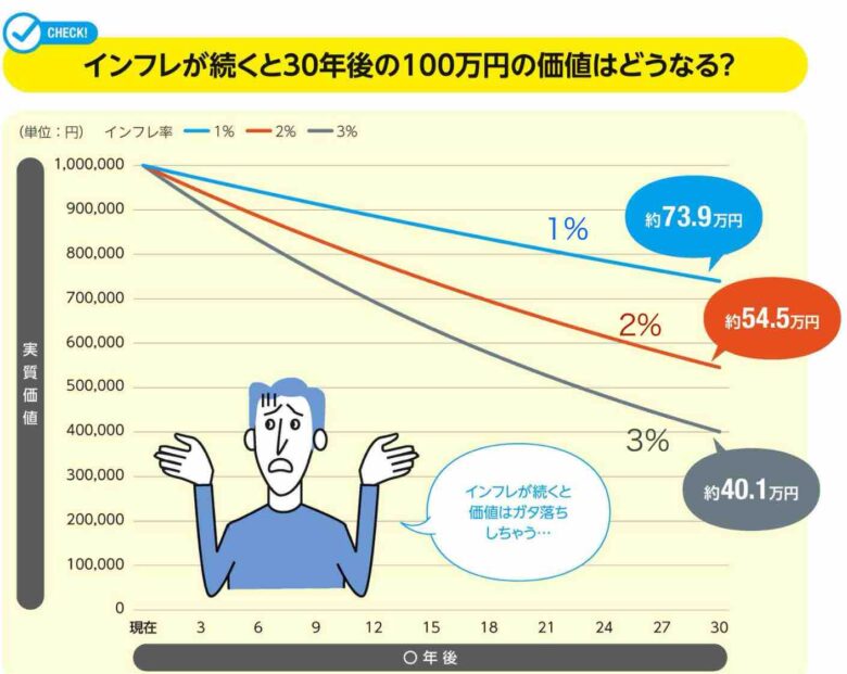 現在のインフレは2〜3%です。30年間3%のインフレが続くと現在の100万円→40万円の価値しかなくなるんですって‼️半分以下なるなんて思ってもみなかったです😅