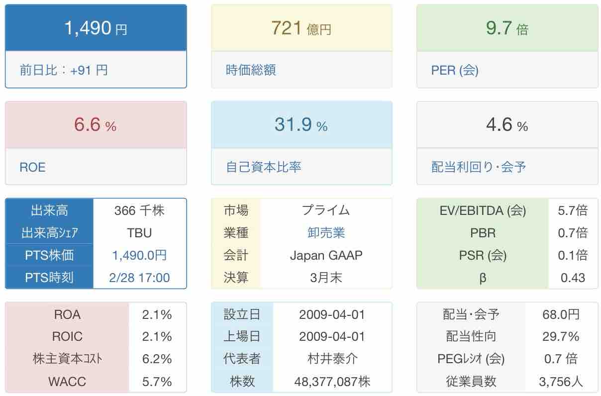 株価1490円として配当利回り4.6%+優待利回り0.34%(100株)=総合利回り4.94%です。