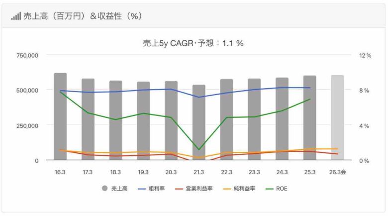 配当金はコロナ禍で減配した後、5期連続増配中です。株価1490円で配当利回りが4.6%、配当性向44%です。