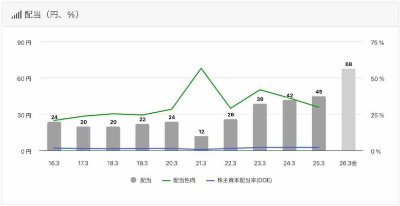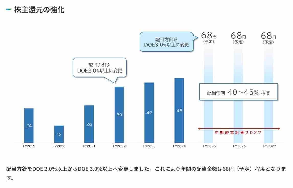 中期経営計画の配当方針を前期からDOE2%→3%へ株主還元を強化しています。1株68円は続けてくれそうですね♪