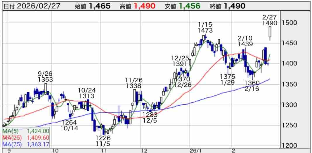 日足のチャートを見ると、12月にゴールデンクロスしています。先週末の株価は株主優待の拡充発表で窓を空けて上昇しています。