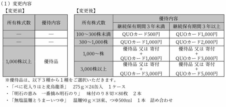 100株以上でQUOカード500円分がもらえるようになります。3年以上保有すると倍の1000円分になる長期保有特典も加わります。