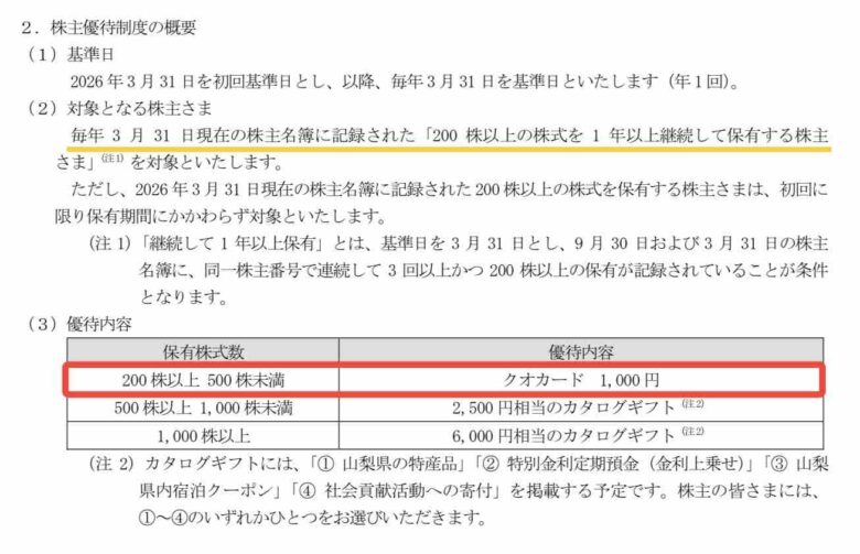 今回新設された株主優待は、3月末権利で200株以上1年以上保有でQUOカード1000円分です。500株以上で2500円分のカタログギフト、1000株以上で6000円分のカタログギフトがもらえます。