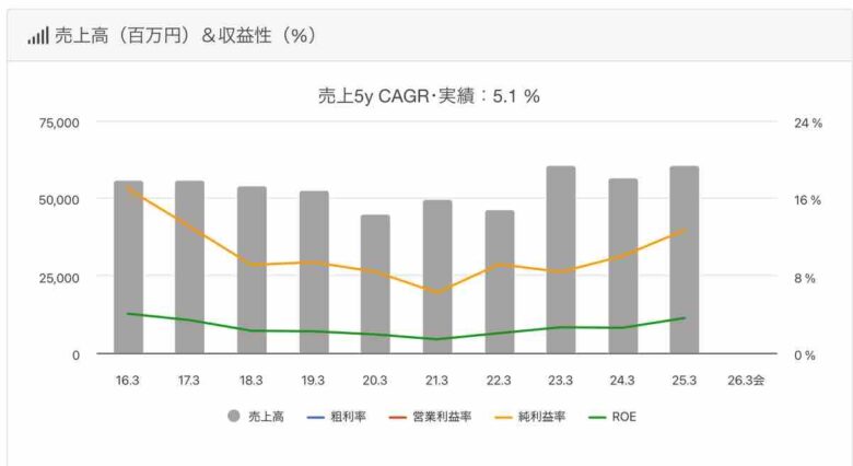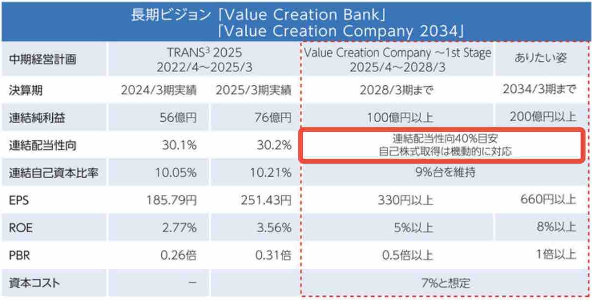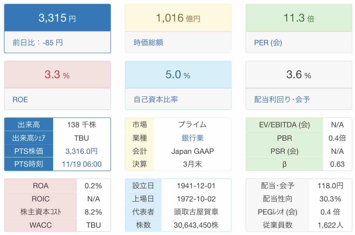 銀行業なので自己資本比率が低いのは仕方ありません。PBR0.4倍、PER11.3倍でミックス係数4.52で割安ですね。(カリスマ投資家みきまるさんはミックス係数5以下が魅力的とおっしゃっています)