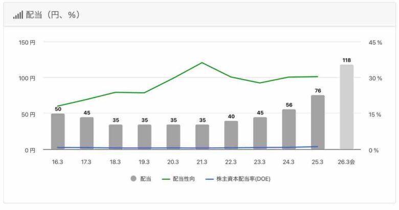 中期経営計画の株主還元方針は連結配当性向40%を目安としていましたので、今期8円の増配となりました。