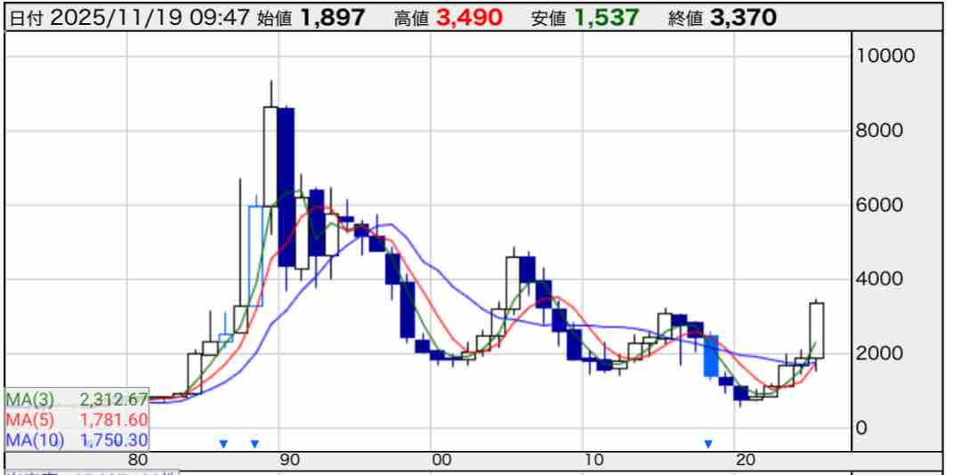 年足チャートでは、長い下落トレンドからようやく脱した感じに見えます。